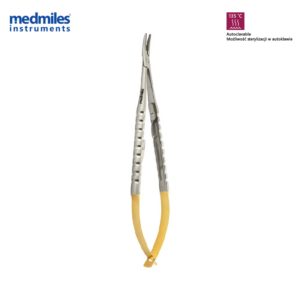 Micro Castroviejo needle holder with curved TC jaws, designed for ultra‑precise suturing in confined operative fields. Curved jaws follow anatomical contours, improving visibility and access.