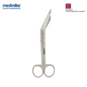 Lister Bandage Scissors, designed for the safe removal of dressings. The angled blades lift bandages away from the skin, preventing cuts.