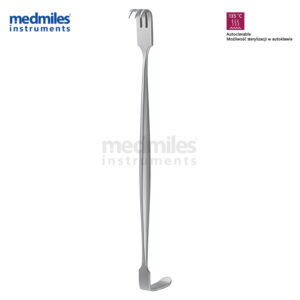 • Double-ended design: one side with three-pronged hooks measuring 8 mm × 7 mm, the other side with a Moberg blade measuring 6 mm × 20 mm, enabling versatile retraction.